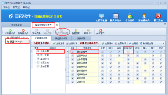 亞拓管理軟件(星光版、標(biāo)準(zhǔn)版、專業(yè)版)、信管飛送貨單軟件、信管飛倉庫管理軟件都支持新增操作員進(jìn)行設(shè)置操作員權(quán)限。對于業(yè)務(wù)單據(jù),部分用戶設(shè)置操作員及權(quán)限時不允許操作員有修改單據(jù)的權(quán)限。