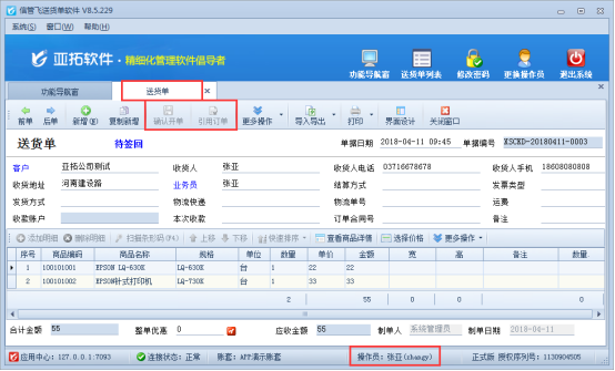 權(quán)限設(shè)置完成后,關(guān)閉當(dāng)前權(quán)限設(shè)置窗口,點擊界面右上角“更換操作員”,可快速切換到登錄軟件界面。選擇操作員“張亞”登錄軟件。打開一個已保存的送貨單,可以看到工具欄中沒有“修改單據(jù)”按鈕,如下圖2所示: