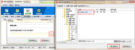 以信管飛送貨單軟件為例。示范下如何附加賬套?打開(kāi)紅色的應(yīng)用中心程序,選擇賬套管理界面,點(diǎn)擊工具欄中的“附加賬套”,點(diǎn)擊后會(huì)彈出附加賬套窗口,如下圖1所示: