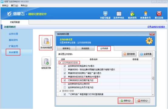 信管飛RMS(進銷存記賬軟件)、信管飛倉庫管理軟件、信管飛送貨單軟件等都可以設置訂單保存時交貨日期不能為空,本篇文章以信管飛送貨單軟件為例介紹一下如何設置訂單保存時交貨日期不能為空。通過“系統管理”——》“系統參數配置”——》“業務參數”可以進入“業務參數”配置界面,在業務單據保存參數內打勾啟用“訂單保存時交貨日期不能為空”參數,如下圖1所示。