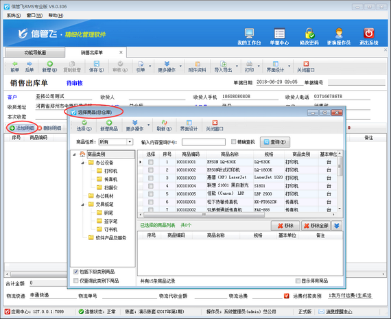 信管飛RMS信管飛倉庫管理軟件信管飛送貨單軟件等為了方便用戶可以快速開單,在單據中點擊“添加明細”按鈕默認都是彈出商品選擇窗口(如下圖一所示),可以快速選擇所需商品信息,但是部分用戶在開單時需要直接錄入新商品,而不是在商品信息庫中進行選擇,對于此種情況,軟件支持設置在單據中點擊“添加明細”按鈕時不彈出商品選擇窗口,本篇文章我們以信管飛RMS為例來詳細介紹一下如何設置在單據中點擊“添加明細”按鈕時不彈出商品選擇窗口?