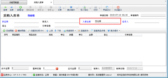 系統參數設置完成后,打開采購和銷售的開單界面,可以看到新增單據界面出入庫的倉庫自動默認為“總倉庫”,如下圖所示: