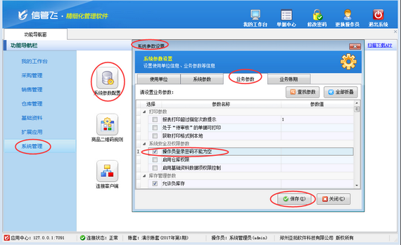 在功能導(dǎo)航窗點擊“系統(tǒng)管理”→“系統(tǒng)參數(shù)設(shè)置”→“業(yè)務(wù)參數(shù)”可以打開“業(yè)務(wù)參數(shù)”配置界面,在系統(tǒng)安全及權(quán)限參數(shù)內(nèi)打鉤啟用“操作員登陸密碼不能為空”參數(shù),然后點擊“保存”按鈕保存設(shè)置,如下圖一所示。