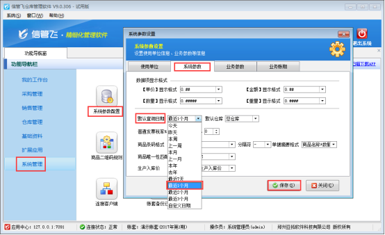 功能導(dǎo)航窗點(diǎn)擊“系統(tǒng)管理”——“系統(tǒng)參數(shù)配置”——“系統(tǒng)參數(shù)”,在“系統(tǒng)參數(shù)”界面可以修改“默認(rèn)查詢?nèi)掌凇保ㄟ@里修改為“最近一個(gè)月”),修改完成之后點(diǎn)擊“保存”按鈕保存配置。如下圖2所示: