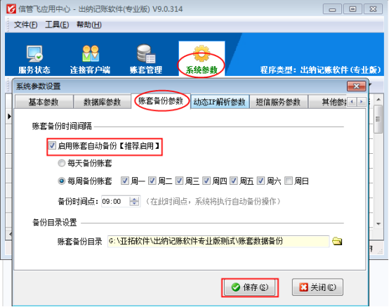 首先打開(kāi)軟件應(yīng)用中心主界面,點(diǎn)擊“系統(tǒng)參數(shù)”—》“賬套備份參數(shù)”,可以打開(kāi)賬套備份參數(shù)界面,賬套備份參數(shù)內(nèi)可設(shè)置是否啟用自動(dòng)備份、備份時(shí)間間隔和備份目錄,如圖1所示: