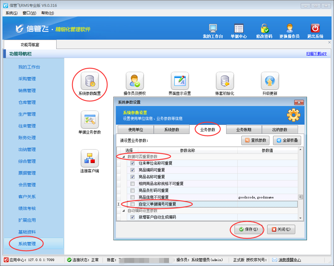 以信管飛RMS為例,在“系統(tǒng)管理”—》“系統(tǒng)參數(shù)配置”—》“業(yè)務(wù)參數(shù)”內(nèi)將“數(shù)據(jù)可否重復(fù)參數(shù)”中的“自定義單據(jù)編號可重復(fù)”參數(shù)的勾選取消,然后保存設(shè)置。如下圖1所示:
