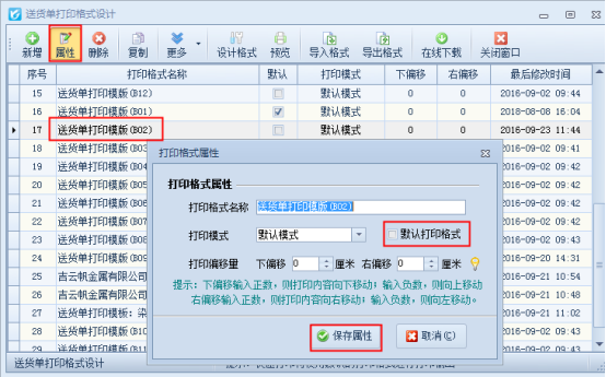 一、在打印格式設(shè)計界面工具欄的“屬性”中進行操作。如示例需要設(shè)置“送貨單打印模板(B02)”為默認模板,選擇B02模板,點擊工具欄中的“屬性”,彈出的打印格式屬性界面,在“默認打印格式”處打勾,然后保存屬性。如下圖1所示: