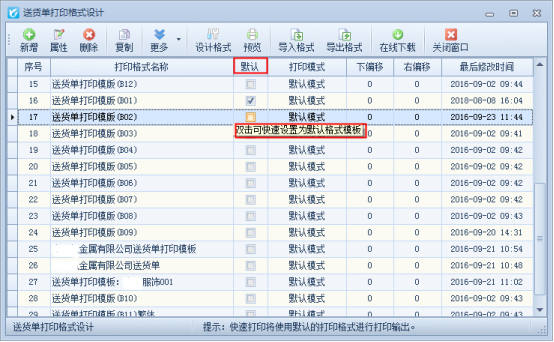 二、在默認框中雙擊快速設(shè)置為默認模板,在打印模板后邊的默認選擇框中,雙擊此處可以快速把模板設(shè)置為默認模板,如下圖2所示: