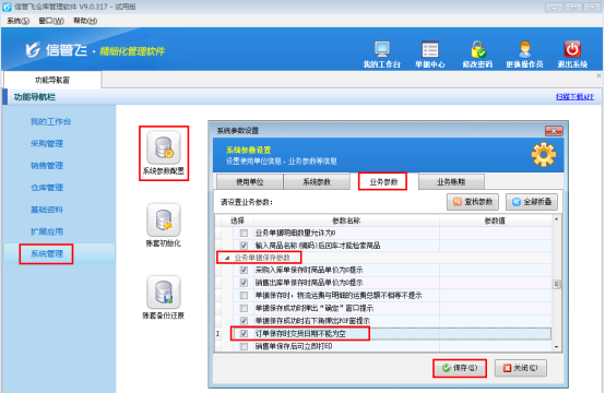 登錄軟件,在功能導航窗點擊“系統管理”—》“系統參數配置”—》“業務參數”可以進入“業務參數”配置界面,在業務單據保存參數內打勾啟用“訂單保存時交貨日期不能為空”參數,如下圖1所示。