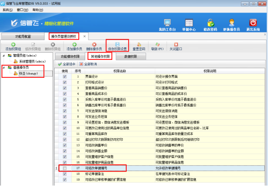 以信管飛倉庫管理軟件為例,示范下如何設置操作員不能修改單據編號的權限。在功能導航窗選擇“系統管理”—》“操作員及授權”進入操作員管理及授權界面。選擇普通操作員組的操作員“張亞”,點擊右側功能權限設置模塊,點擊“其他操作權限”,在下邊的權限中找到“可修改單據編號”,把勾選“√”符號取消(鼠標單擊即可取消)。點擊保存權限設置。如下圖1所示: