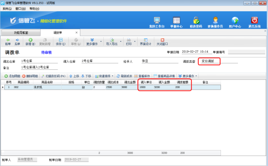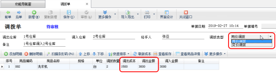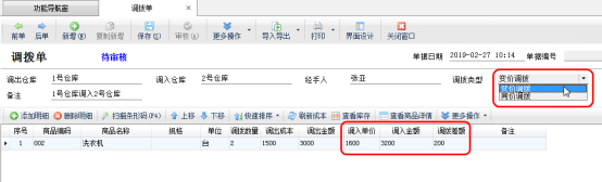 ②選擇調(diào)撥類(lèi)型后,下面的單據(jù)明細(xì)會(huì)自動(dòng)切換需要輸入的數(shù)據(jù)項(xiàng)(調(diào)入單價(jià)、調(diào)入金額、調(diào)撥差額)。