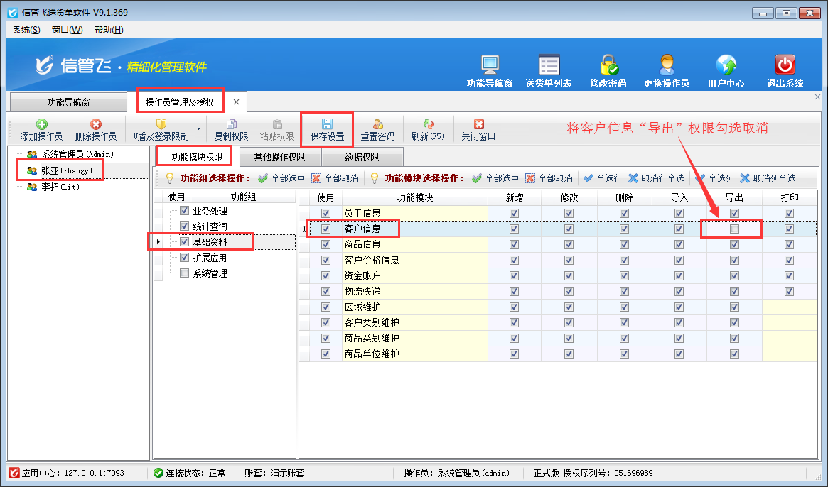 信管飛送貨單軟件信管飛RMS信管飛倉庫管理軟件等都支持管理基礎(chǔ)資料信息和允許設置多個操作員進行登錄軟件。軟件支持將基礎(chǔ)資料信息以EXCEL的形式導出放到自定義的文件夾內(nèi)以供備份或保存,如果需要設置操作員不允許導出客戶信息,如何設置?本文以信管飛送貨單軟件為例,示范下如何設置操作員不可導出客戶信息。