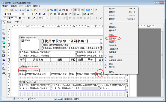 在模板設(shè)計(jì)器界面。單擊“細(xì)項(xiàng)數(shù)據(jù)”中的金額文本框,然后鼠標(biāo)點(diǎn)擊右鍵,會(huì)彈出一列選擇,選擇“顯示格式”,進(jìn)入格式設(shè)置界面,修改小數(shù)位,確認(rèn)保存即可。如下圖所示: