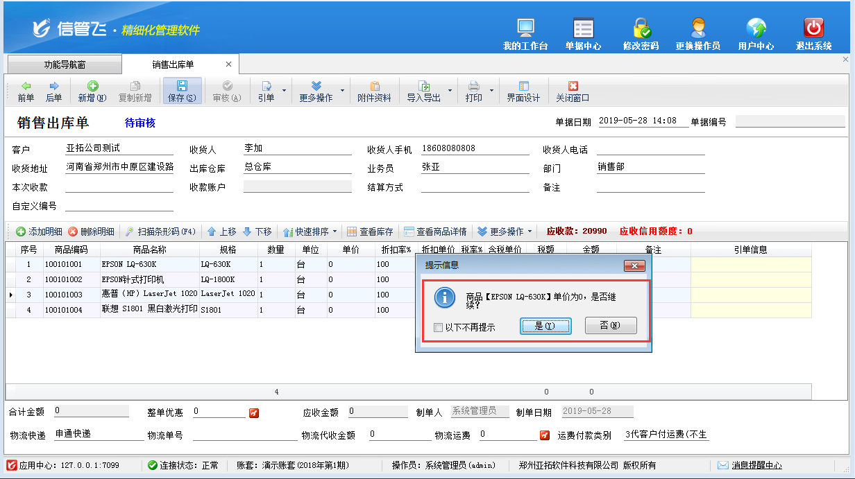 信管飛RMS信管飛倉庫管理軟件信管飛送貨單軟件等在業務單據保存時如果商品單價為0,系統會彈出提示信息,是否需要繼續保存,如下圖一所示,這樣以免用戶在添加商品明細時忘了填寫單價,好及時錄入,但是有一部分用戶在開單據時只需要填寫商品數量,不需要填寫單價,該怎么設置系統才能不彈出以下提示信息呢?本篇文章以信管飛RMS專業版為例介紹一下如何設置出庫單保存時商品單價為0系統不彈出提示信息?