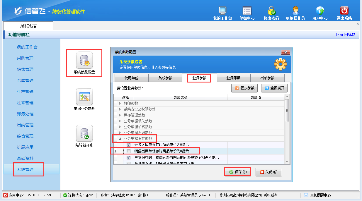 歡迎免費下載試用這款可設置業務單據保存時商品單價為0是否提示進銷存管理軟件信管飛RMS