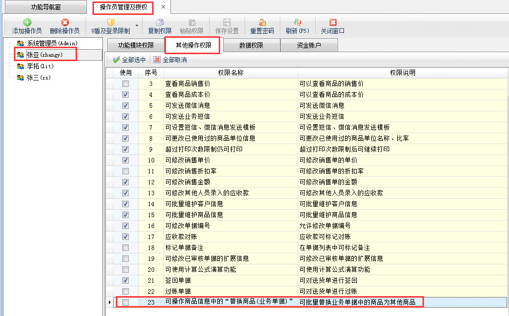 本文以信管飛送貨單軟件為例,在功能導(dǎo)航窗點(diǎn)擊“系統(tǒng)管理”—》“操作員及授權(quán)”進(jìn)入操作員管理及授權(quán)界面,如下圖所示:選擇操作員“張亞”,在右側(cè)權(quán)限設(shè)置界面,選擇“其他操作權(quán)限”,把權(quán)限“可操作商品信息中的‘替換商品(業(yè)務(wù)單據(jù))’功能”取消勾選,然后保存配置。
