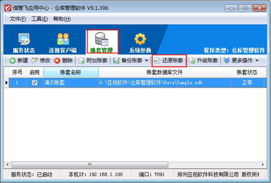 本文以“信管飛倉庫管理軟件”為例,示范如何還原備份賬套數據。