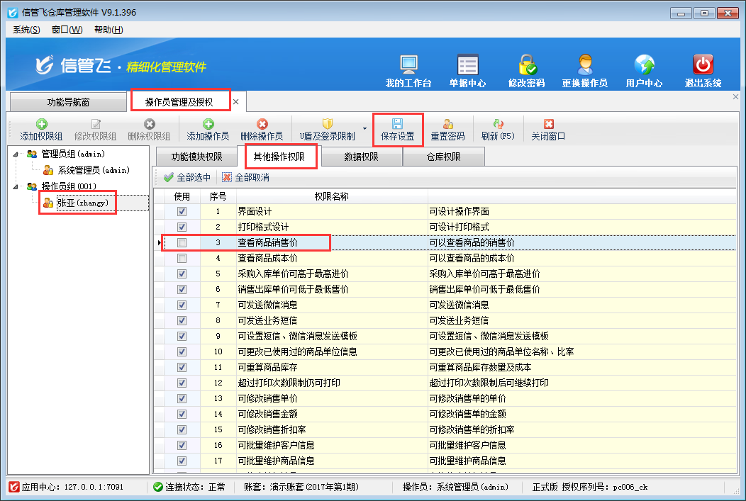 登錄信管飛倉庫管理軟件,在功能導航窗點擊“系統管理”—》“操作員及授權”,即可進入“操作員管理及授權”界面,如下圖所示,以操作員“張亞”為例,鼠標選中操作員后,點擊“其他操作權限”,取消勾選“查看商品銷售價”,然后點擊“保存權限設置”即可。