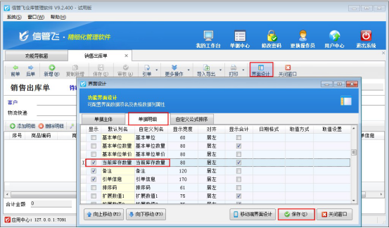 打開軟件的“銷售管理”模塊,新開一個銷售出庫單,在工具欄點擊“界面設計”選擇“單據(jù)明細”項,找到“當前庫存數(shù)量”數(shù)據(jù)項并勾選上,保存界面設計,如下圖所示: