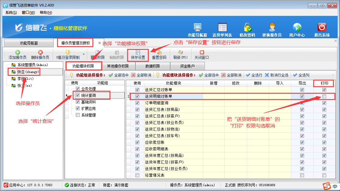 登錄軟件,在功能導航窗點擊“系統管理”—》“操作員及授權”,進入“操作員管理及授權”界面,選擇操作員“張亞”,在其右側的功能模塊權限內選擇“統計查詢”模塊,將送貨明細對賬單的“打印”權限勾選取消,然后保存設置,如下圖所示: