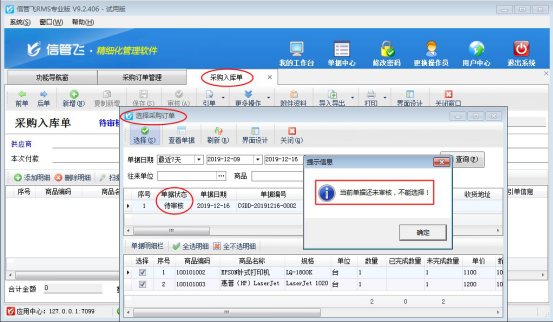 信管飛RMS軟件是集“采購管理、銷售管理、庫存管理、往來賬管理”一體的進銷存軟件,軟件可引用訂單生成對應的采購入庫單和銷售出庫單。軟件默認引用訂單需要訂單處于審核狀態(tài),否則引用不了(如下圖所示),有的客戶存引用未審核的訂單,本文示范下如何設置?