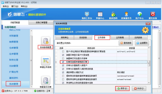 在功能導航窗點擊“系統(tǒng)管理”→“系統(tǒng)參數配置”→“業(yè)務參數”可以打開“業(yè)務參數”配置界面,在業(yè)務單據相關參數內打鉤啟用“引單可選擇未審核的訂單”參數,然后點擊“保存”按鈕保存設置,如下圖所示: