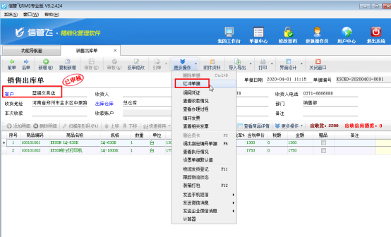 打開客戶名稱有誤的銷售出庫單,點(diǎn)擊“更多操作”—》“紅沖單據(jù)”,來將“已審核”的單據(jù)進(jìn)行紅沖,紅沖后的單據(jù)會(huì)變?yōu)闊o效,紅沖相當(dāng)于作廢,相應(yīng)的應(yīng)收款會(huì)刪除,之前對庫存的影響也會(huì)解除。如下圖所示: