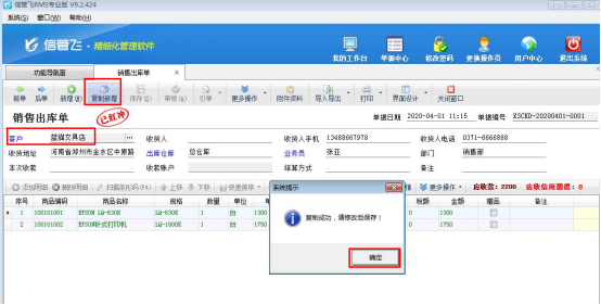 單據(jù)紅沖后,點(diǎn)擊工具欄中的“復(fù)制新增”按鈕,系統(tǒng)彈出提示框“復(fù)制成功,請修改后保存!”,點(diǎn)擊“確定”按鈕,如下圖所示: