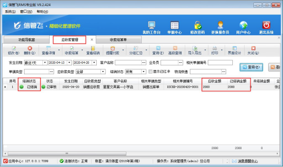 收款結算單單據保存并審核之后,更新應收款的結銷狀態(tài),在應收款管理界面可以查看應收款結銷情況,如下圖所示,客戶“星星文具第一小學店”應收金額2000元已結銷,未結銷金額為0。