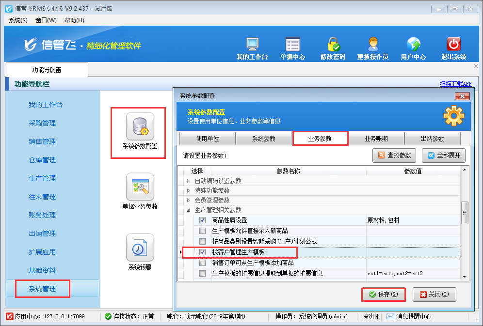 在功能導(dǎo)航窗點(diǎn)擊“系統(tǒng)管理”—》“系統(tǒng)參數(shù)配置”—》“業(yè)務(wù)參數(shù)”打開業(yè)務(wù)參數(shù)配置界面,然后在生產(chǎn)管理相關(guān)參數(shù)中打鉤啟用“按客戶管理生產(chǎn)模板”參數(shù),然后點(diǎn)擊“保存”按鈕保存參數(shù)配置,如下圖所示。