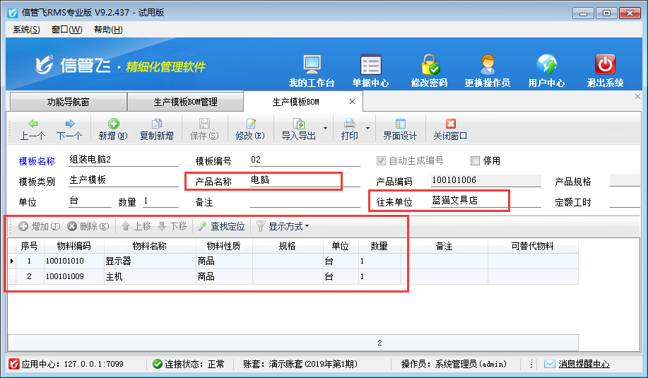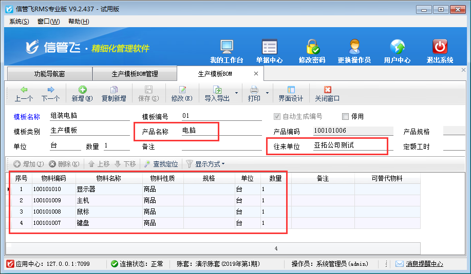 參數(shù)配置完成之后,打開生產(chǎn)管理模塊,重新新增生產(chǎn)模板BOM表時(shí),即可選擇往來單位,如下圖所示,在給“亞拓公司測試”、“藍(lán)貓文具店”兩家客戶生產(chǎn)同樣的產(chǎn)品“電腦”時(shí)設(shè)置的不同的生產(chǎn)模板,所需的原材料不同。