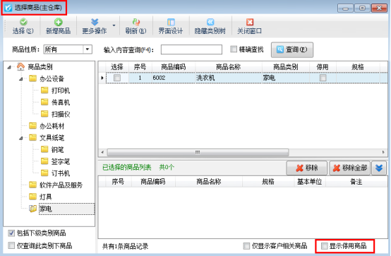 設(shè)置完成之后,新開一個單據(jù),添加商品明細(xì)進(jìn)行選擇商品時,“選擇商品”窗口默認(rèn)不顯示已停用的商品,如圖2所示。