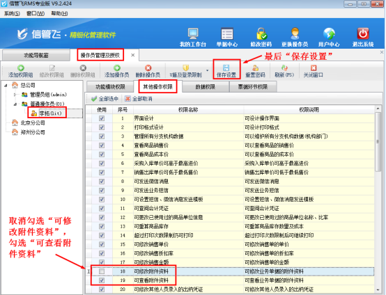 在功能導(dǎo)航窗點(diǎn)擊“系統(tǒng)管理”—》“操作員及授權(quán)”打開操作員管理及授權(quán)界面,選擇操作員“李拓”,在“其他操作權(quán)限”中,取消勾選“可修改附件資料”,勾選“可查看附件資料”,然后點(diǎn)擊“保存設(shè)置”按鈕保存權(quán)限設(shè)置,如下圖所示: