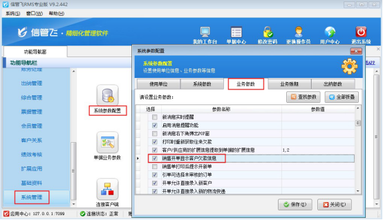 在功能導(dǎo)航窗點(diǎn)擊“系統(tǒng)管理”—》“系統(tǒng)參數(shù)配置”—》“業(yè)務(wù)參數(shù)”,即可進(jìn)入到“業(yè)務(wù)參數(shù)”配置界面,在業(yè)務(wù)單據(jù)相關(guān)參數(shù)內(nèi)打鉤啟用“銷售開單顯示客戶欠款信息”參數(shù),然后保存,如下圖所示: