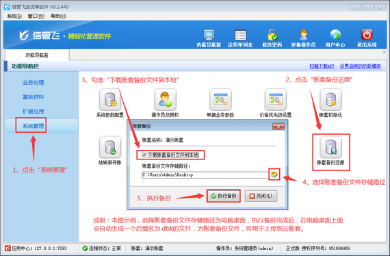 請用系統(tǒng)管理員賬號(hào)登錄信管飛送貨單軟件試用版,然后在功能導(dǎo)航窗中點(diǎn)擊“系統(tǒng)管理”—》“賬套備份還原”,在打開的“賬套備份”窗口勾選“下載賬套備份文件到本地”,選擇備份文件存儲(chǔ)路徑,然后“執(zhí)行備份”即可,備份完成后在所選備份文件存儲(chǔ)的路徑,會(huì)自動(dòng)生成一個(gè)后綴名為.dbk的文件,為賬套備份文件,可用于上傳到云賬套,如下圖所示。
