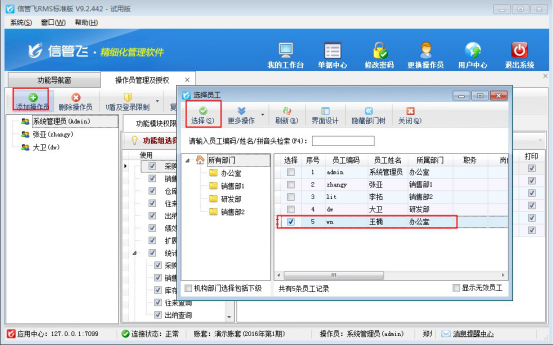 添加操作員:可以將“員工信息”中的員工設(shè)置為操作員,支持批量設(shè)置。點(diǎn)擊“添加操作員”按鈕,然后在打開的“選擇員工”窗口勾選相應(yīng)的員工后點(diǎn)擊“選擇”按鈕添加操作員。如下圖所示: