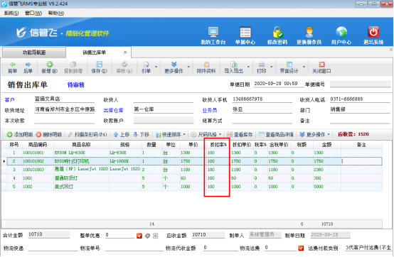 信管飛送貨單軟件、信管飛倉庫管理軟件、信管飛RMS(進銷存軟件)開單時,當商品存在打折情況時,支持錄入商品的折扣率。當商品明細的內容比較多時,為了快速開單,提高效率,可以批量更新單據明細中的折扣率。下面我們以信管飛RMS專業版為例詳細介紹下如何批量修改商品折扣率。