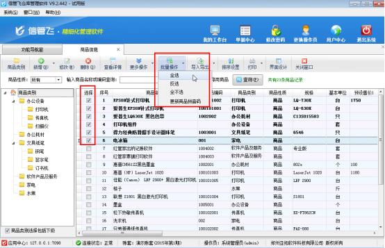 在功能導(dǎo)航窗選擇“基礎(chǔ)資料”—》“商品信息”進(jìn)入商品信息管理界面,選擇工具欄的“批量操作”按鈕,進(jìn)入批量操作模式,選擇需要?jiǎng)h除的商品信息(批量操作支持全選、全不選、反選),如下圖所示: