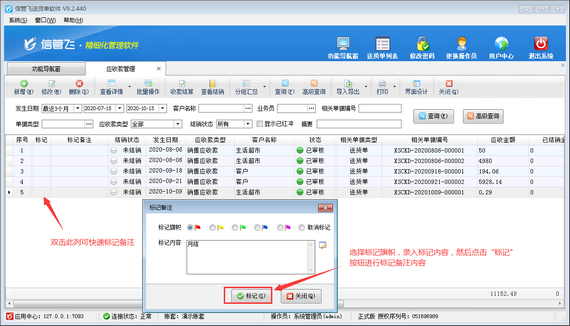 在應(yīng)收款管理界面,選中一條應(yīng)收款記錄后,雙擊“標(biāo)記”列,系統(tǒng)彈出“標(biāo)記備注”窗口,在“標(biāo)記備注”窗口選擇標(biāo)記旗幟,錄入標(biāo)記內(nèi)容,然后點(diǎn)擊“標(biāo)記”按鈕,即可對(duì)應(yīng)收款信息標(biāo)記備注內(nèi)容,如下圖所示。