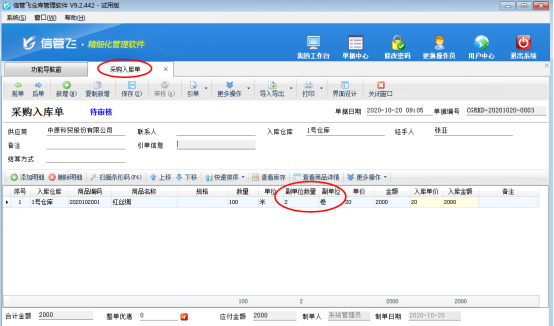 商品保存后,在功能導航窗點擊“采購管理”—》“采購入庫單”,新增采購入庫單,在業務單據明細中可以輸入副單位的數量,如圖3所示。