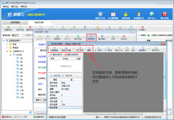 信管飛出納記賬軟件新增或者修改日記賬憑證時,支持添加文檔、圖表等附件資料,可掃描或導入與日記賬憑證相關的電子文件,方便用戶更全面、直接地查詢日記賬發生的全過程,有利于企業對內部流水賬的管理(如下圖所示),附加資料窗口默認顯示模式支持大窗口和小窗口兩種顯示模式,本文介紹一下如何設置附件資料窗口默認顯示模式?
