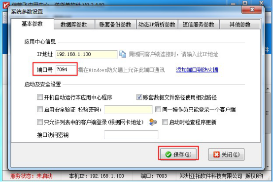 打開應用中心程序,點擊“系統參數”,在基本參數中修改下端口號,比如送貨單默認端口號是7093,如果占用沖突,可修改為7094、7095...,修改后點擊保存,然后退出重啟應用中心程序,如下圖所示: