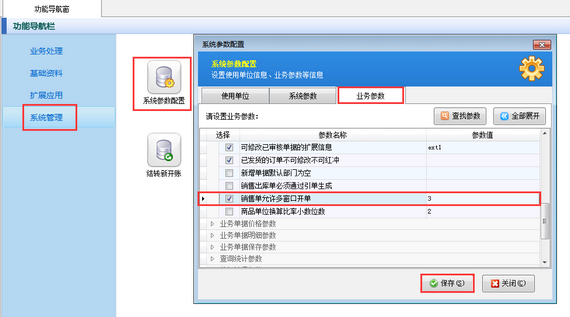 在功能導(dǎo)航窗點(diǎn)擊“系統(tǒng)管理”—》“系統(tǒng)參數(shù)配置”—》“業(yè)務(wù)參數(shù)”打開(kāi)業(yè)務(wù)參數(shù)配置界面,然后在業(yè)務(wù)單據(jù)相關(guān)參數(shù)內(nèi),勾選啟用“銷售單允許多窗口開(kāi)單”參數(shù),并設(shè)置下參數(shù)值(同時(shí)支持窗口數(shù)),然后點(diǎn)擊“保存”按鈕保存配置即可,如下圖所示。