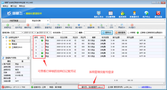 設置完成之后,我們分別使用系統管理員賬號和操作員賬號登陸軟件并查看現金日記賬,可以看到系統管理員可查看已審核的出納日記賬憑證,而操作員張亞不可查看已審核的出納日記賬憑證,如下圖所示。