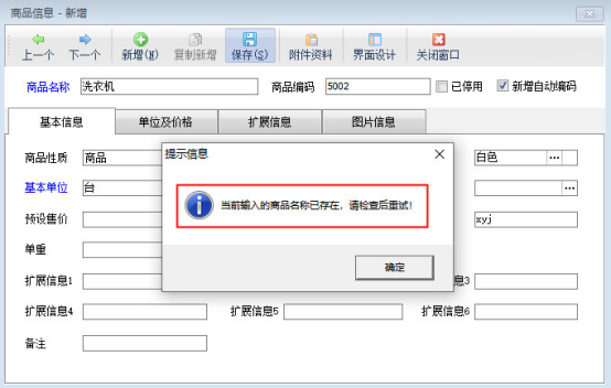 設(shè)置完成后,打開(kāi)功能導(dǎo)航窗的“基礎(chǔ)資料”—》“商品信息”,新增一個(gè)商品,輸入和之前已有商品一樣的名稱(chēng),就可以保存成功了。如下圖所示: