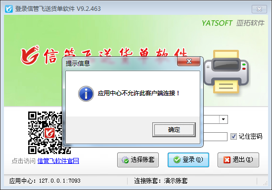 部分信管飛軟件用戶在登錄軟件時會出現(xiàn)軟件登錄不成功的情況,如下圖所示,系統(tǒng)彈出提示信息:應(yīng)用中心不允許此客戶端連接!