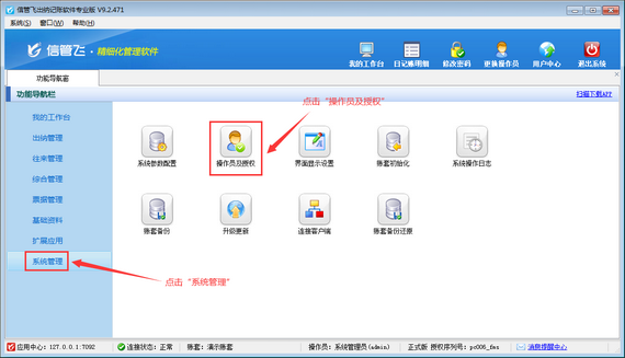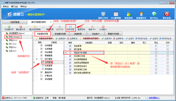 登錄軟件,在功能導航窗點擊“系統管理”—》“操作員及授權”,進入“操作員管理及授權”界面,選擇操作員“張亞”,在其右側的功能模塊權限內選擇“出納查詢”模塊,將資金日(月)報表的“使用”權限勾選取消,然后保存設置,如下圖所示。
