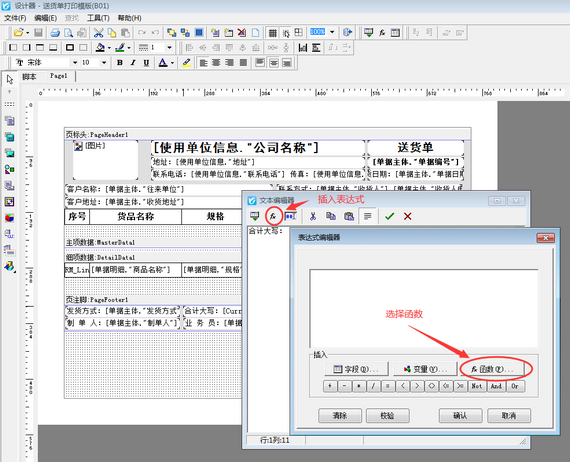 打開一個已保存的送貨單,然后在單據(jù)界面點擊“打印”—“打印格式設(shè)計”按鈕,進入“送貨單打印格式設(shè)計”界面,以內(nèi)置模板(B01)為例,選擇打印格式模版(B01),然后點擊“設(shè)計格式”按鈕進入模版設(shè)計器界面,如下圖所示。