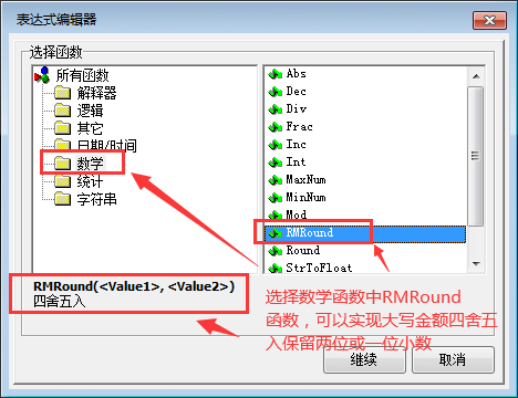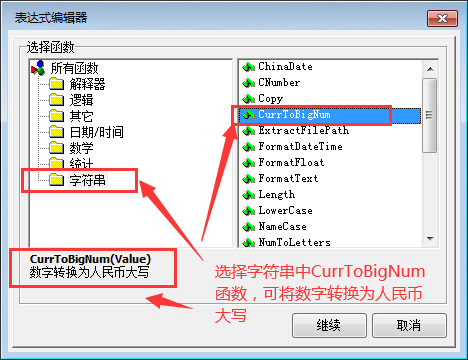 打開模版設(shè)計界面后,在模版合適的位置添加一個文本框,雙擊文本框打開文本編輯器,然后錄入內(nèi)容“[CurrToBigNum([RMRound([單據(jù)主體."應(yīng)收應(yīng)付金額"],2)])]”或者是通過“插入表達式”插入數(shù)字轉(zhuǎn)換人民幣大寫函數(shù),如下圖所示。