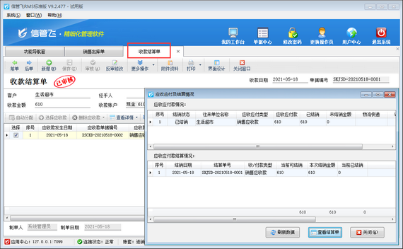 信管飛RMS是進銷存一體化的軟件,支持管理往來應收應付款,銷售出庫單審核后自動生成銷售應收款信息,可以對銷售應收款進行收款結算,如銷售應收款已結銷的情況下,發現銷售出庫單有填開錯誤,需要修改,系統默認是不能直接進行反審修改操作,如下圖所示。